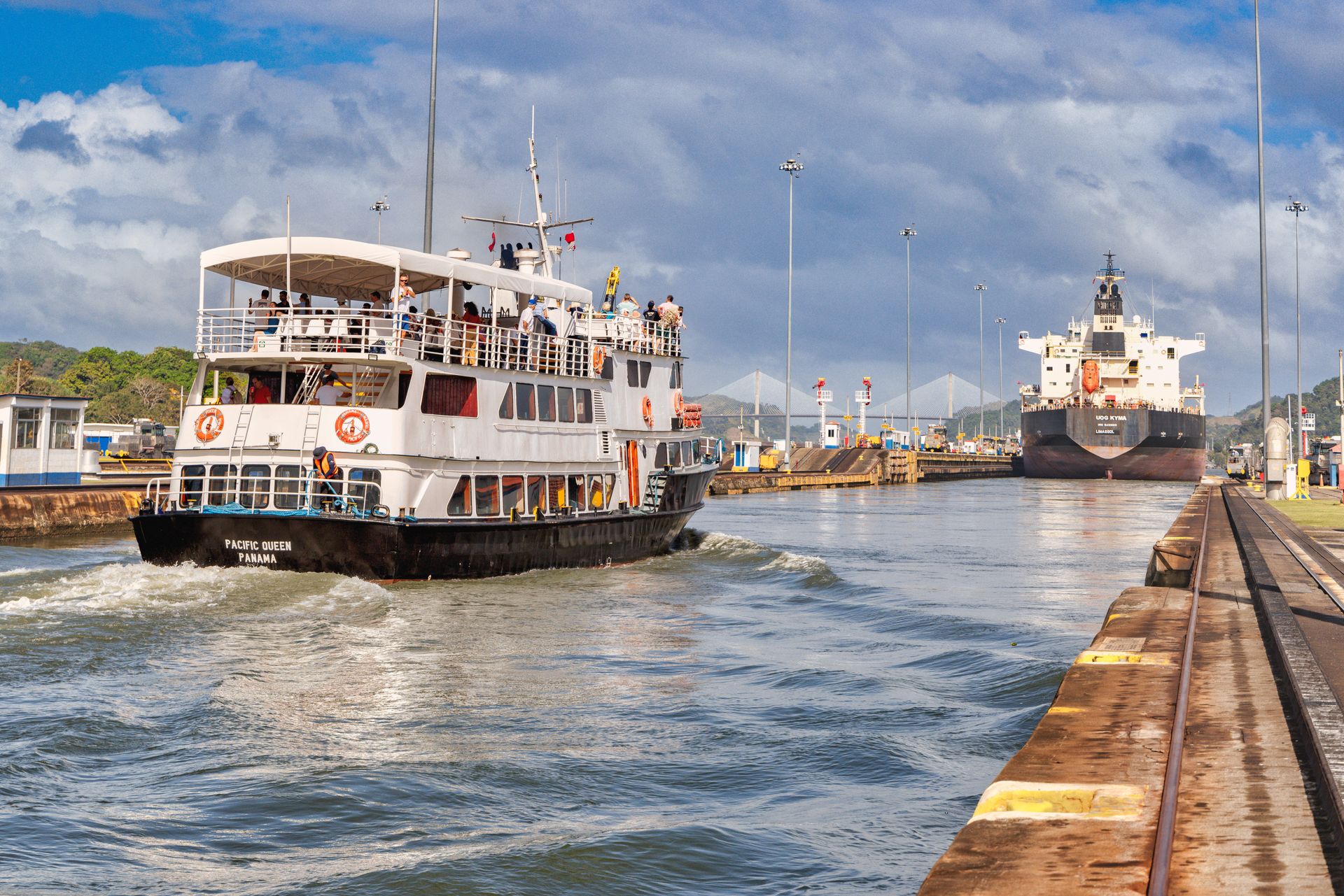 The Panama Canal partial transit tour begins with the Pacific Queen entering the Miraflores Locks where the vessel is raised 18 meters above sea level in two distinct steps. You will then enter Miraflores Lake, which is a small artificial body of fresh water that separates Miraflores from Pedro Miguel Locks. Next, the Pacific Queen will enter Pedro Miguel Locks, which is the second set of locks on the Pacific side, and here the vessel is raised 9 meters in one step. After exiting the Pedro Miguel Locks, you will be able to view the new Centennial Bridge which crosses over the Canal.